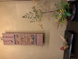 料亭でのもう一つの遊びは、手に入れた書画骨董を持ち寄り、仲間と鑑賞し合うというものがある。私も料亭を使う時は、顔ぶれを想像して何らかの物を持ち込み鑑賞してもらうように心がけている。今月の宴では、青不動の大津絵(表装が紙でぼろぼろだが)を床の間に掛け、山仕事をする人の手作りのキジ車(人吉の土産物)を組み合わせた。安価なものだが、オリジナルな空間演出ができたのは良かったと思っている。 |